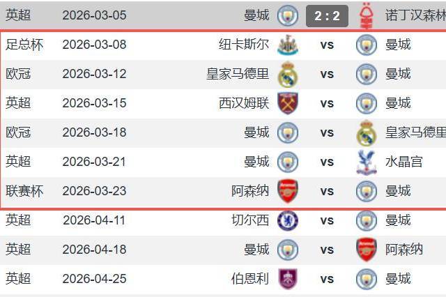 曼城2-2森林后还有16天5赛 3连客纽卡皇马铁锤帮+战枪手争联赛杯